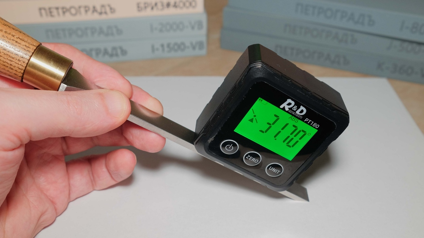 Фаска с завода сделана примерно под 30°, но реальный угол у самой кромки чуть больше. Это происходит из-за финальной доводки мягким полировальником: он эластичный и немного меняет геометрию у самого края.