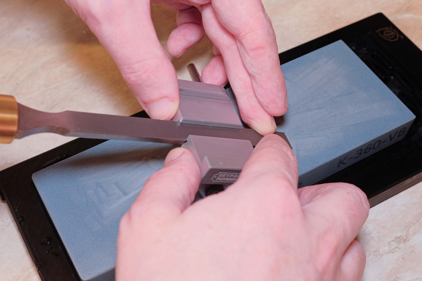 Работал на K-360-VB, пока его риски не стали примерно такими же по глубине, как остатки заводской шлифовки. Камень быстро обновляет зерно и сразу даёт суспензию, поэтому я его не притирал - только проверил плоскость после замачивания. Замачивание заняло 10 минут. Понять, что камень готов, легко: пузырьки перестают выходить, а вода держится лужицей, а не впитывается. Если работать часто, обычно хватает 2-6 минут для всей серии камней.
