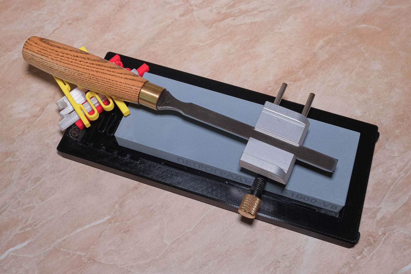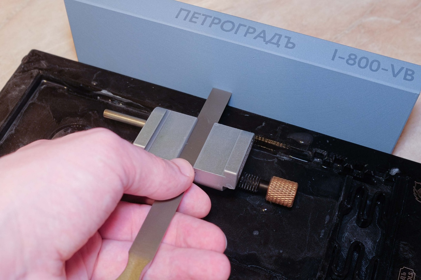 Кроме камней мне нужны держатель брусков и тележка для заточки, чтобы без проблем удерживать точный угол. На снимке ниже: держатель ПЕТРОГРАДЪ с установленным камнем, пружинки для фиксации брусков разных размеров и тележка ПЕТРОГРАДЪ.