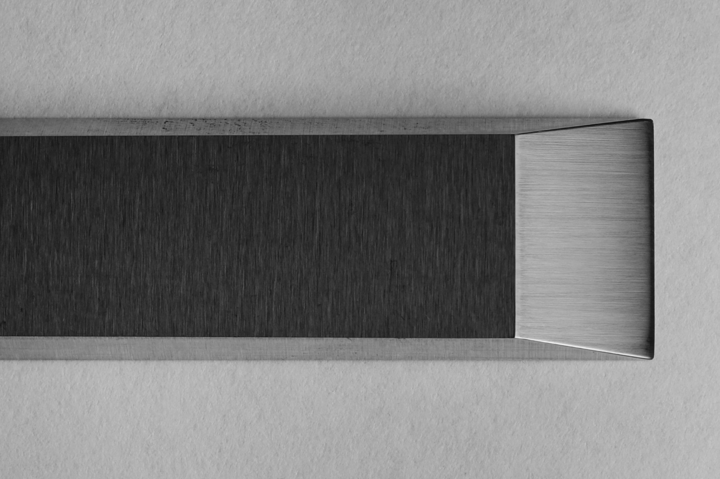 Следы шлифовки идут вдоль кромки, а у самой режущей кромки есть небольшая полоска без рисок - её, похоже, дополнительно заполировали.