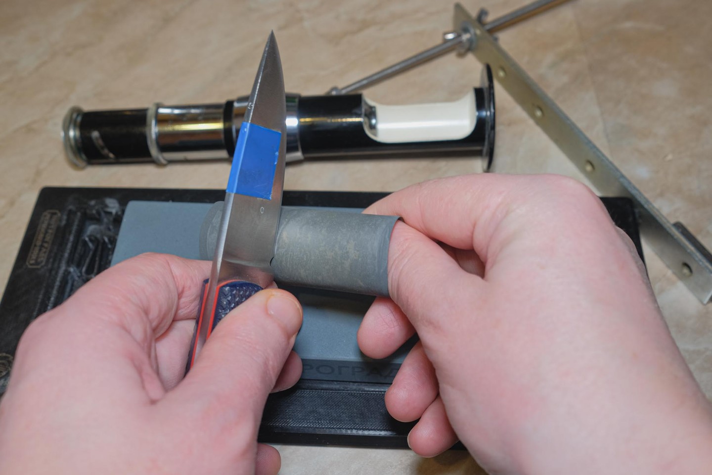 На снимке клинок с бруском БРИЗ, на котором я выполнял его финишную заточку.