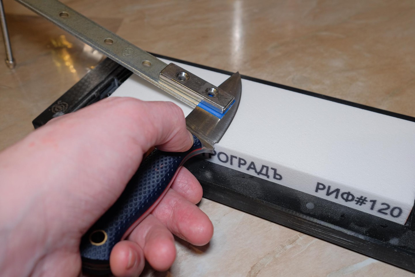 Подровняв кромку, снова вернулся на брусок 500 грит и доработал до момента, когда для невооружённого взгляда кромка перестала давать блик на свету.