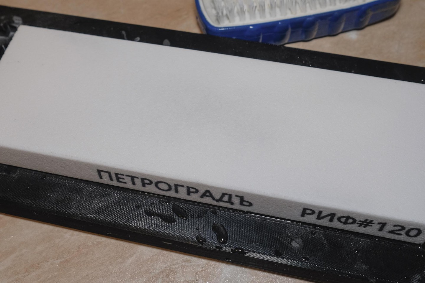 Что касается поведения бруска: несмотря на то, что выраженной лужицы воды при работе не было, она успела уйти пока я ставил камеру и делал предыдущий снимок, поверхность бруска достаточно оказалось просто слегка дополнительно ополоснуть, и на увлажнённой, но без явного слоя воды начать работу.