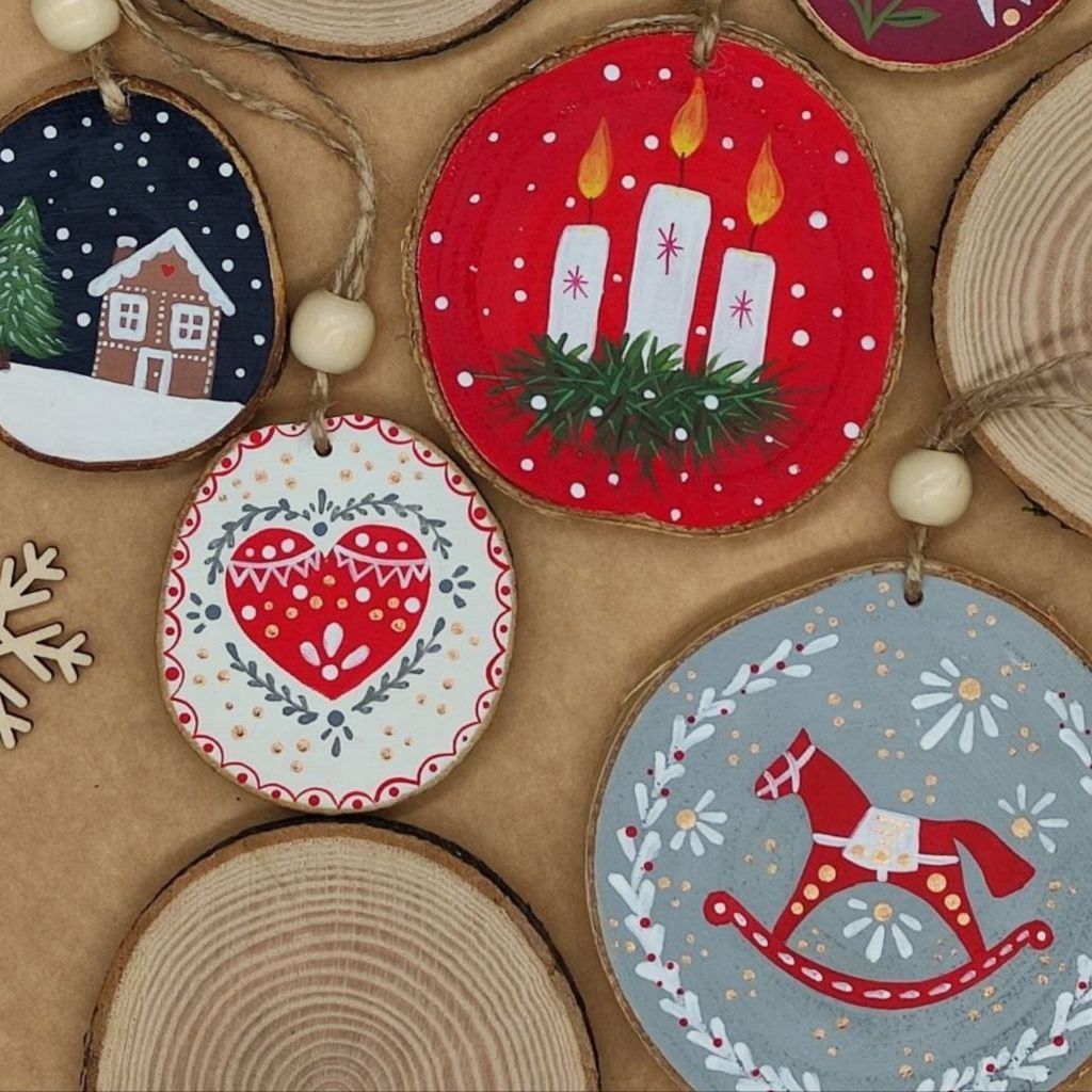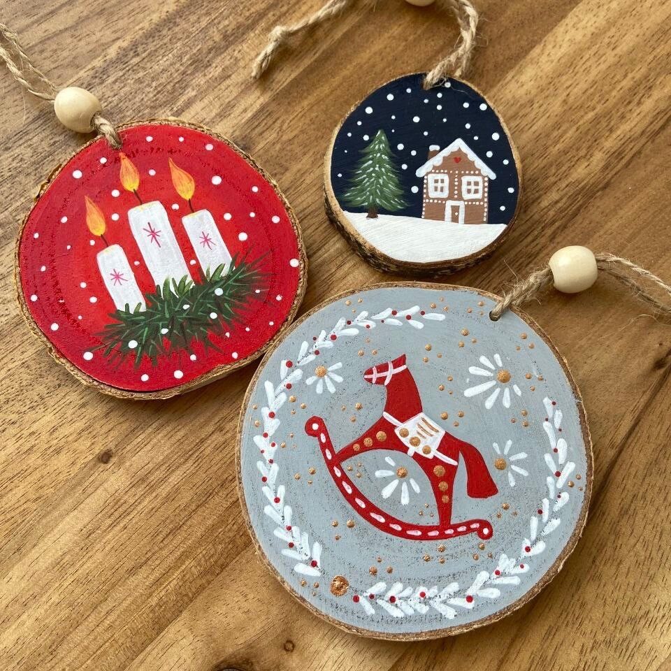 Диаметр спилов 7-9 см. Роспись акриловыми красками. По завершению работы к спилу добавим красивый шнурок с деревянным шариком. А готовое украшение станет прекрасным подарком или украшением на елку, сделанным своими руками.