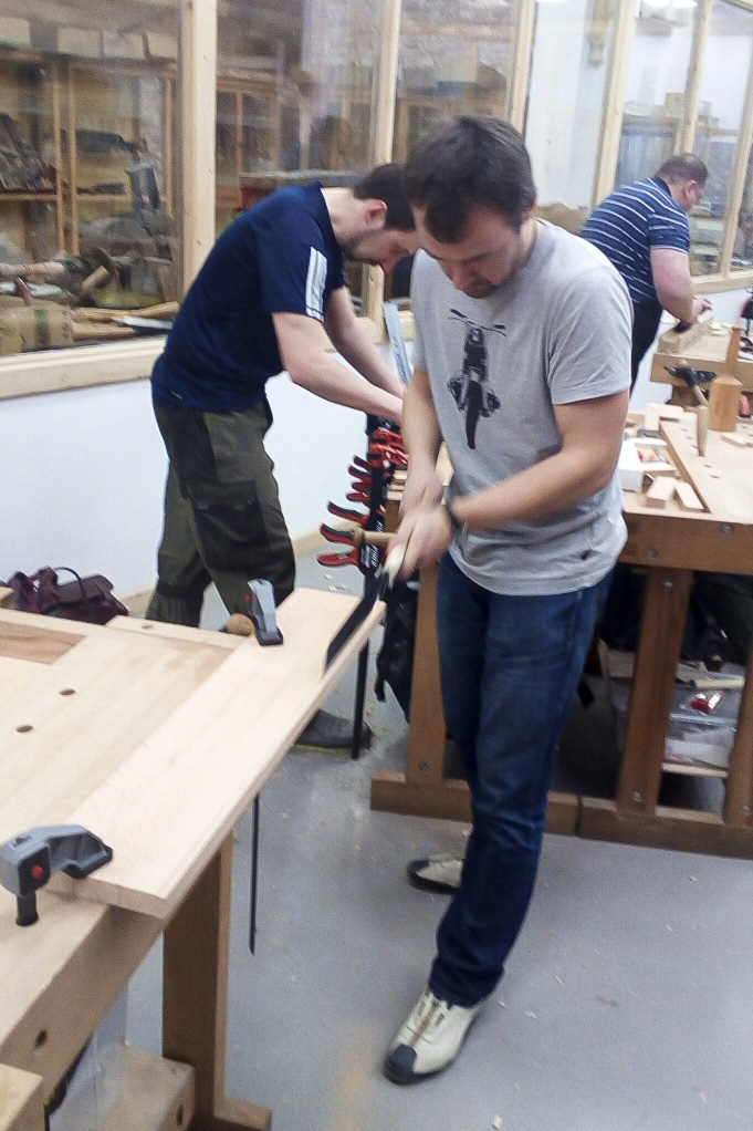 Первый день начинается с изучения свойств древесины, последний день оканчивается проектированием мебели. В середине этого пирога – заточка режущего инструмента, строгание, сплачивание, изготовление кондукторов и приспособлений для заточки и строгания щитов, изготовление столярных соединений, включая несколько видов и способов соединения «ласточкин хвост». Теория заточки, теория резания, все группы и виды ручного инструмента, виды столярных конструкций, способы обработки, финишное покрытие и много-много практической работы. Таким образом передаются накопленные мастером знания и опыт.