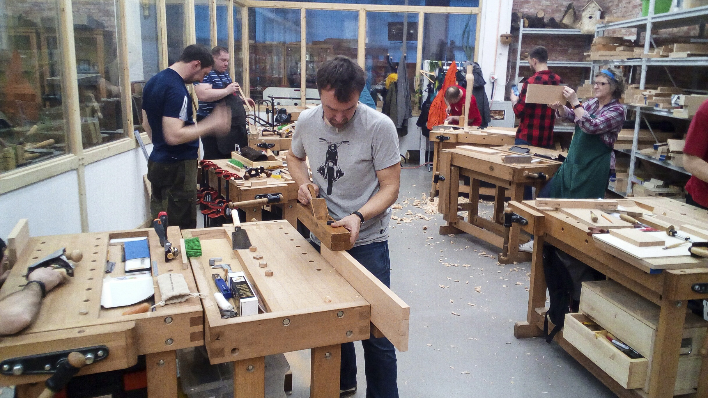 В нашей столярной мастерской 12 учебных верстаков, два преподавателя столярного мастерства, большой опыт проведения курсов. Структура практикума выстроена следующим образом: каждый день разбит на несколько блоков; каждый блок состоит из трёх частей: