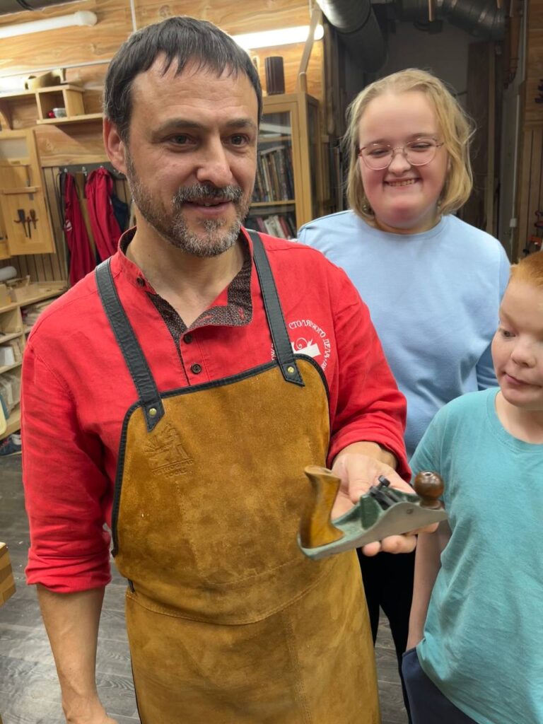 Ребята познакомились с невиданными инструментами и старинными технологиями работ по изготовлению эксклюзивной мебели из массива и редких, элитных пород древесины.