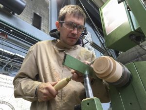 Во второй месяц обучения мы делаем больше работ: миска, бокал, совок, шкатулка и тарелка. При точении этих изделий можно увидеть разницу в резании вдоль волокон и поперёк волокон. Для такой работы мы используем 10 мм рейер для точения чаш (bowl gouge). По окончанию мы доводим внутреннюю поверхность скраппером, то есть циклей (scraper bowl gouge).