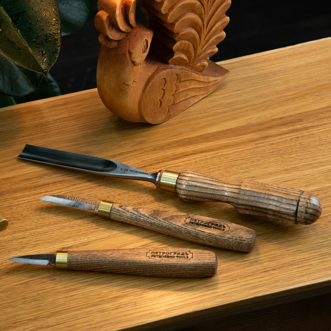 На время обучения всем курсантам выдаются подготовленные, заточенные стамески, резцы и ножи по дереву марки Петроградъ: